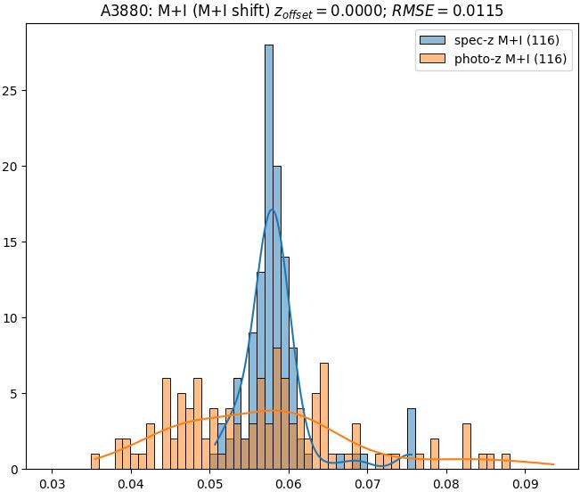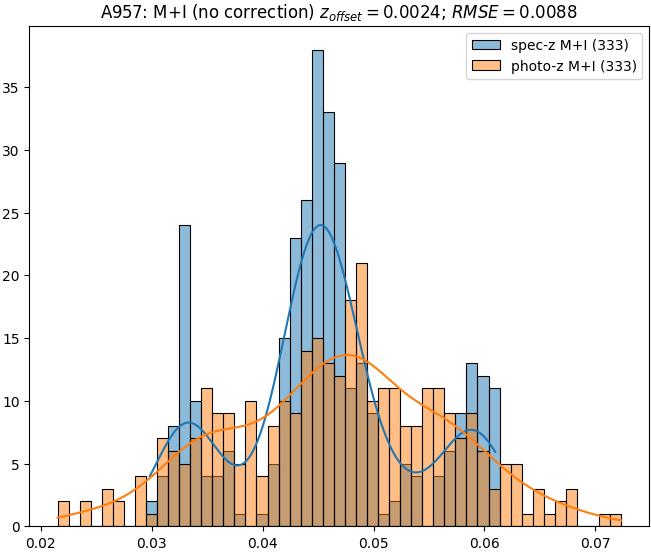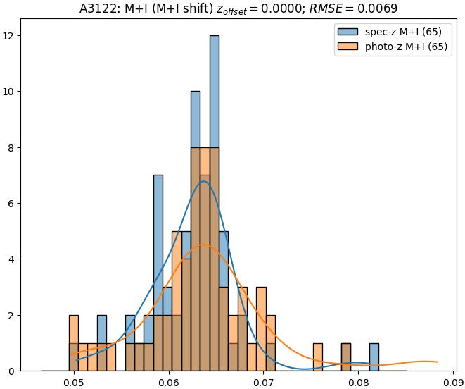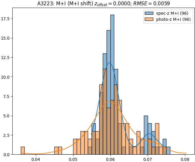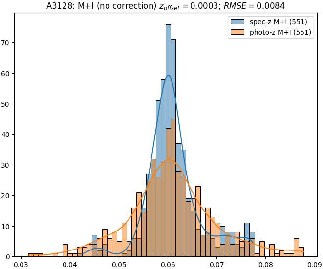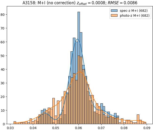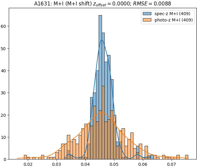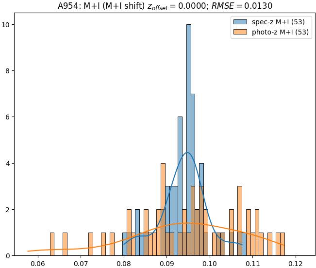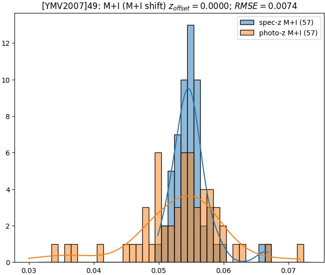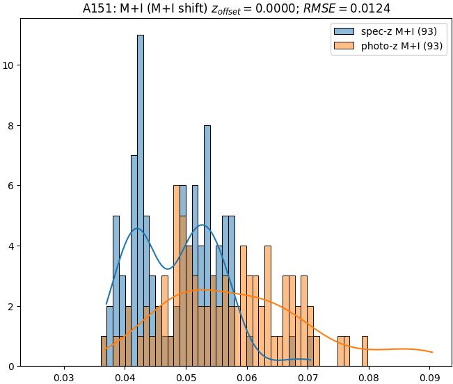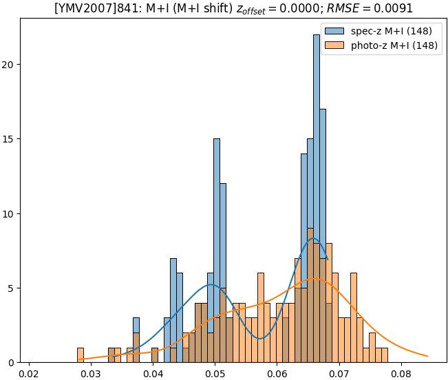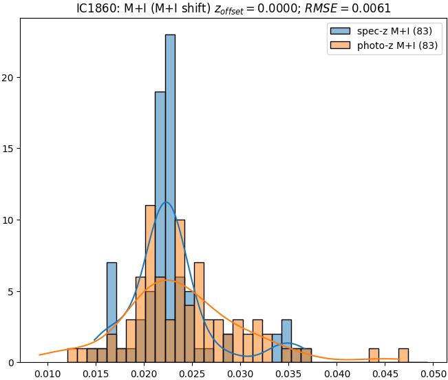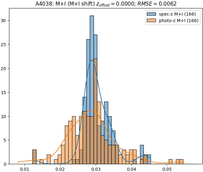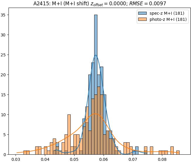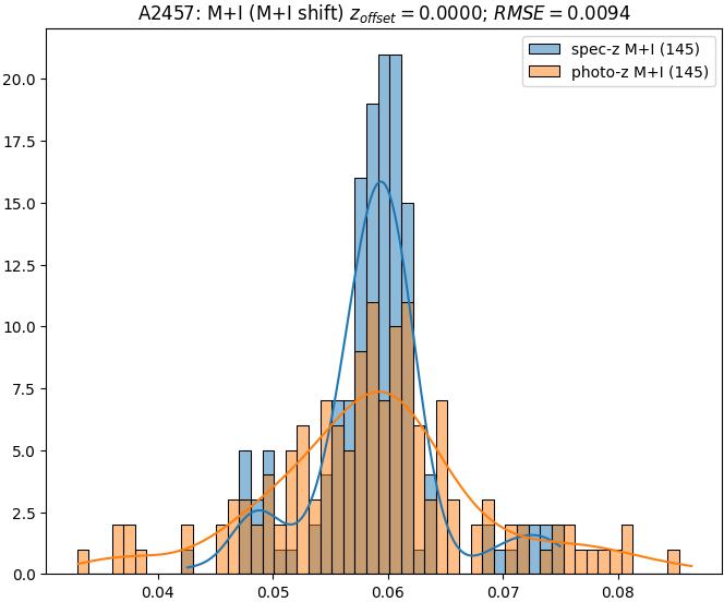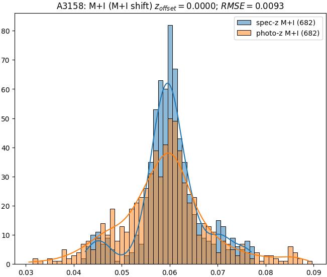 - eM+I (M): RMSE between reference and estimated redshift corrected by members+interlopers-offset in the members sample