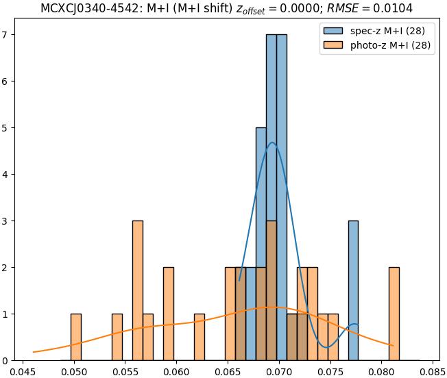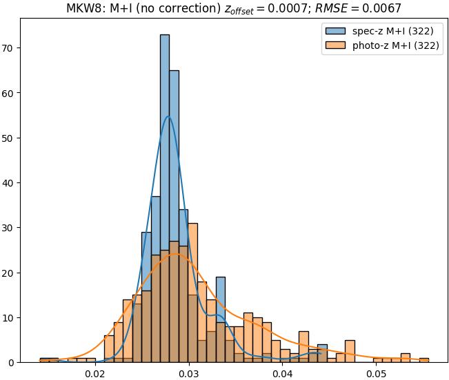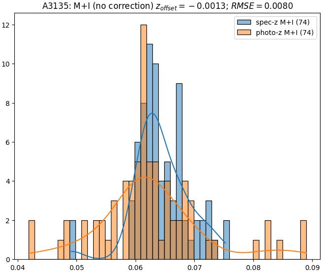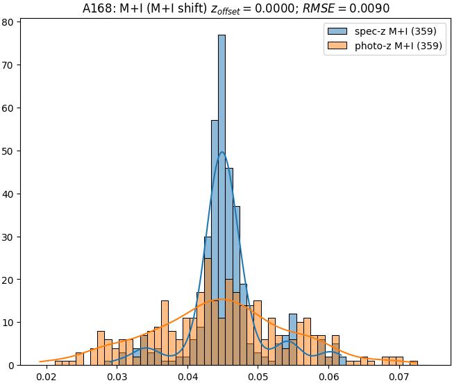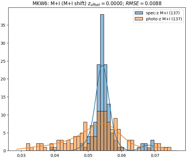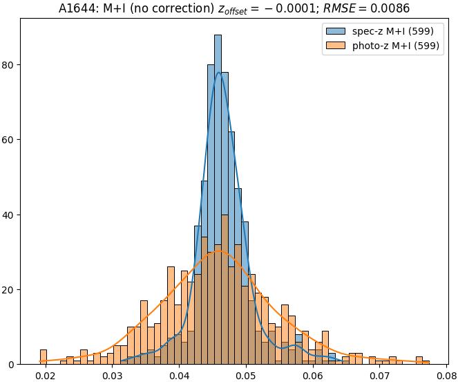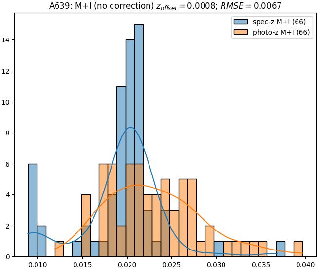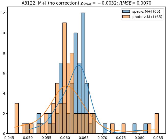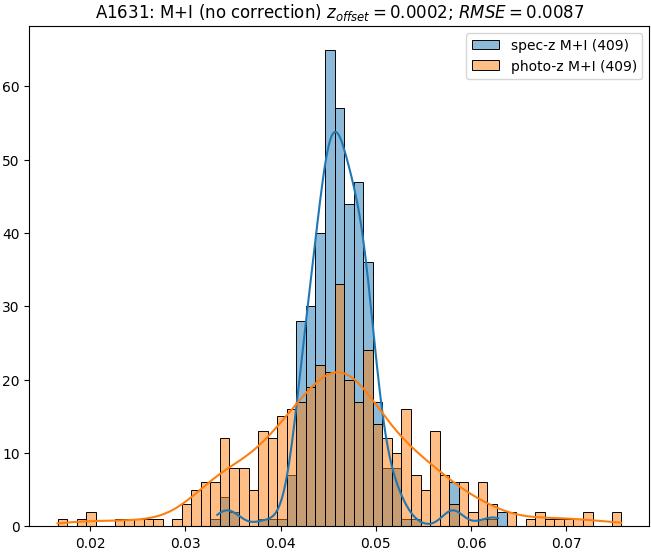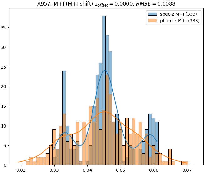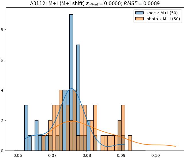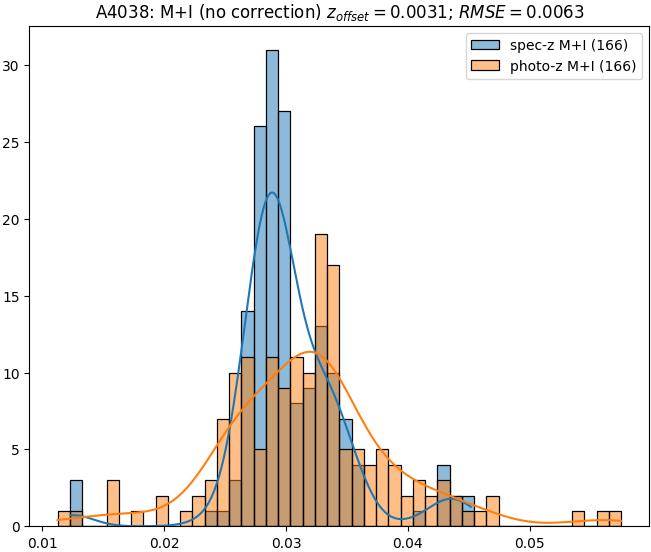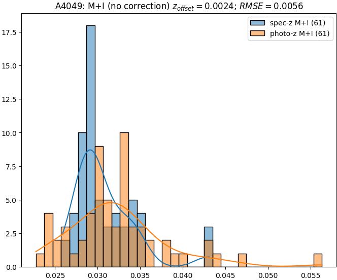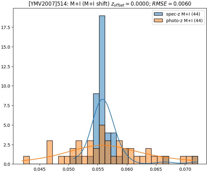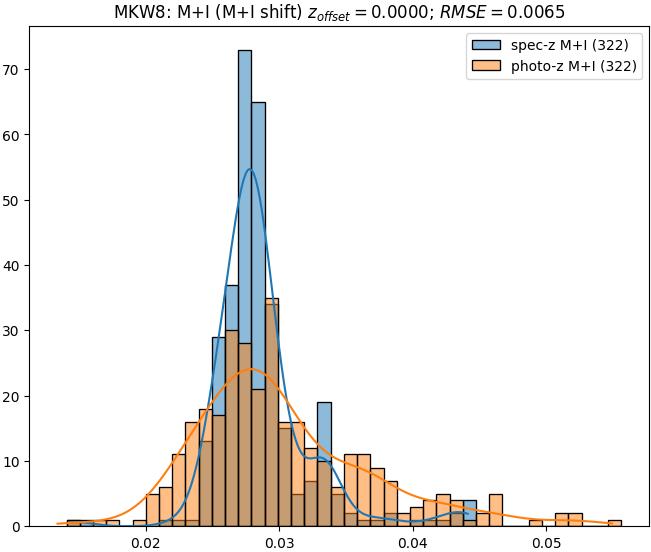 - eM+I (M): RMSE between reference and estimated redshift corrected by members+interlopers-offset in the members sample
