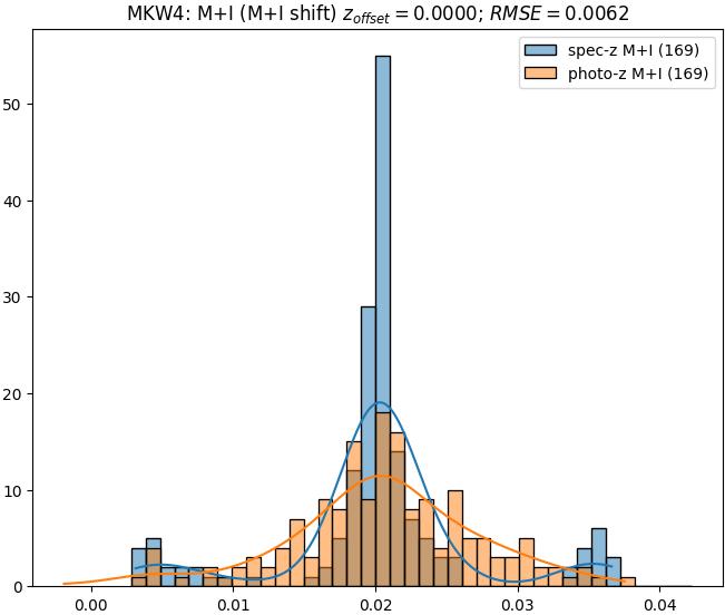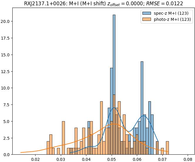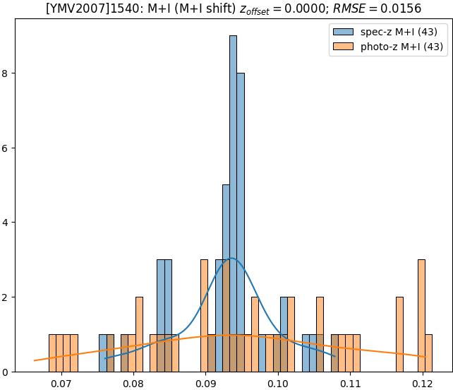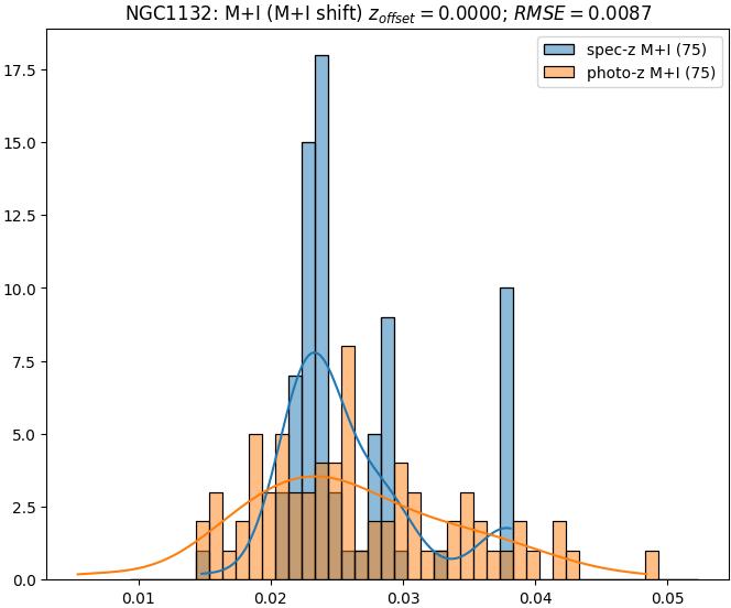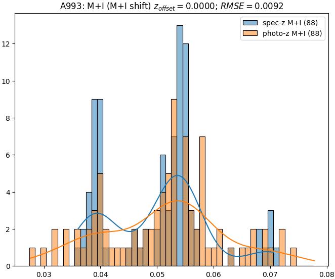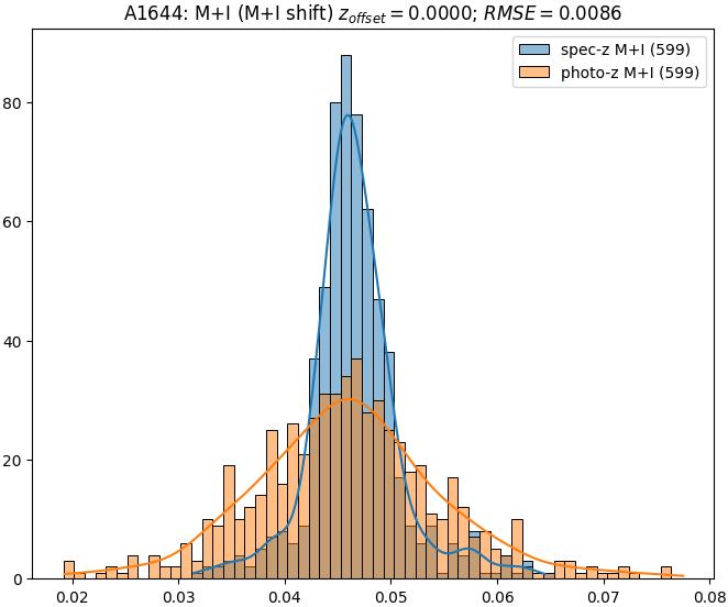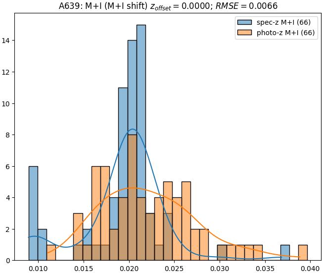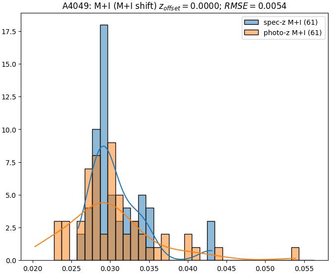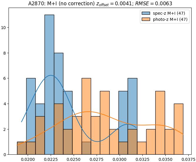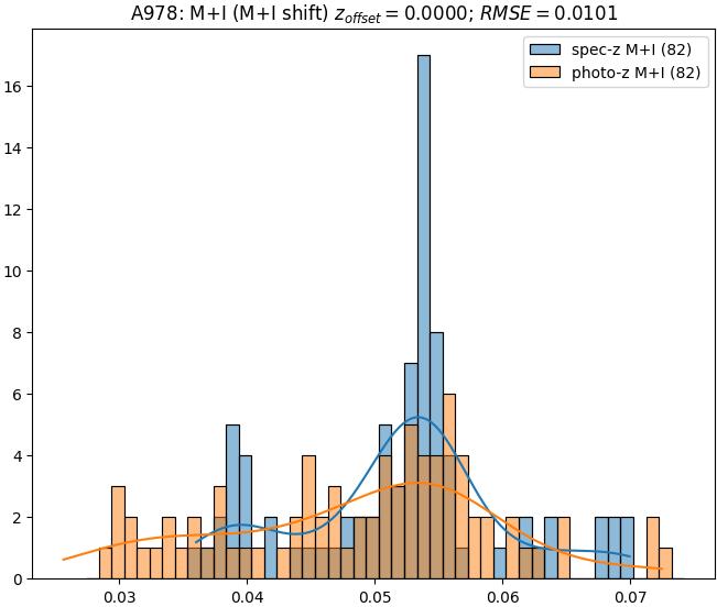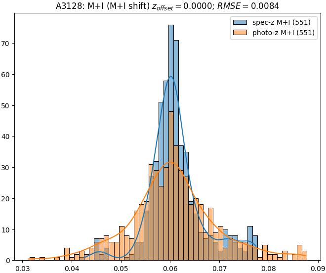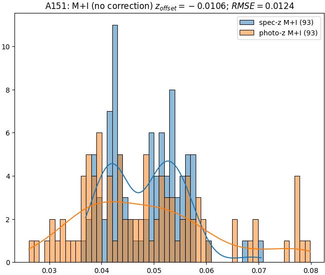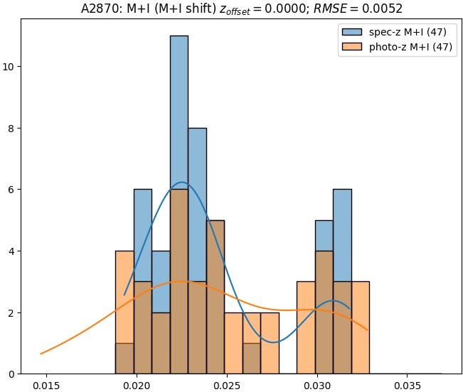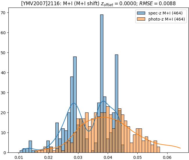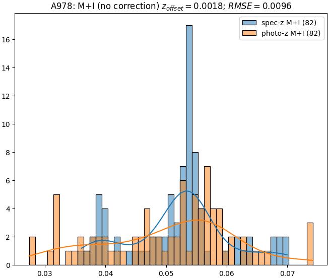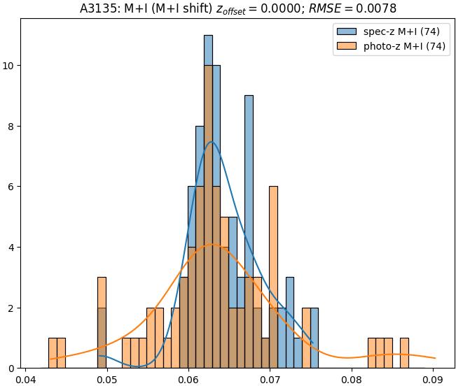 - eM+I (M): RMSE between reference and estimated redshift corrected by members+interlopers-offset in the members sample