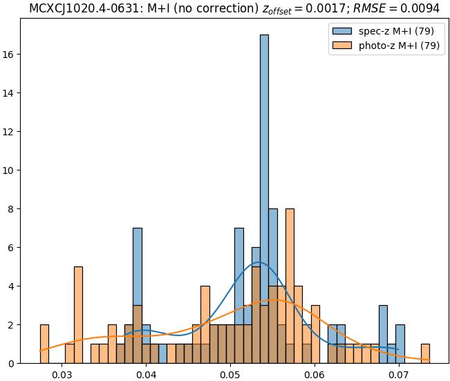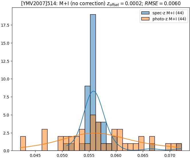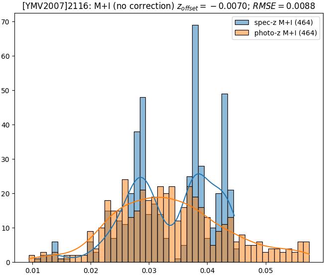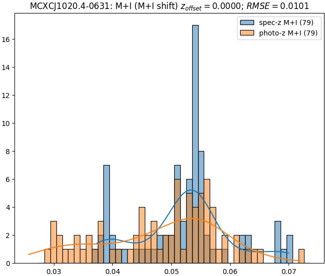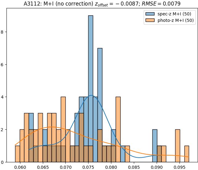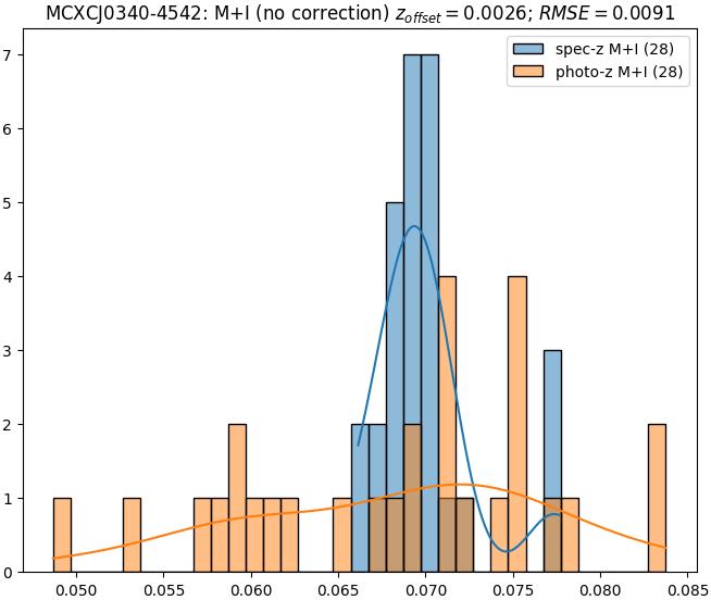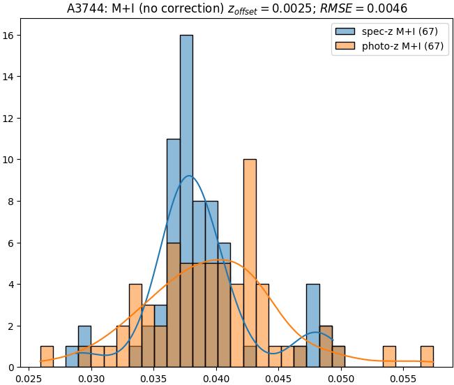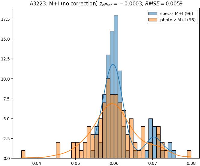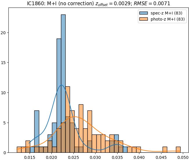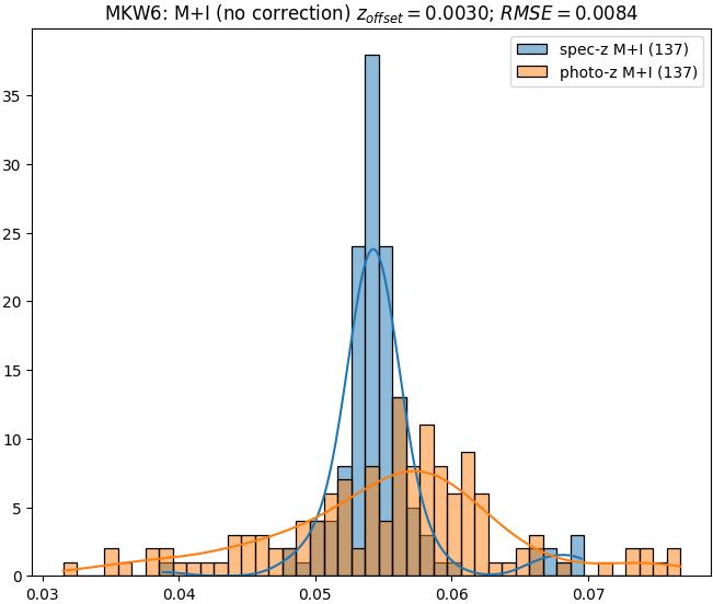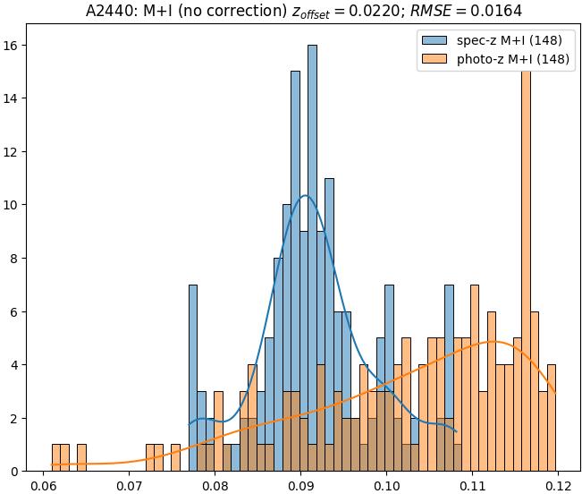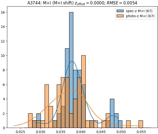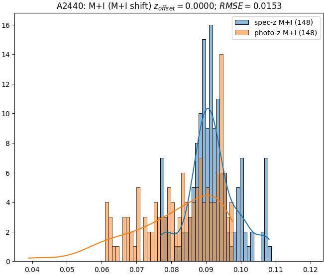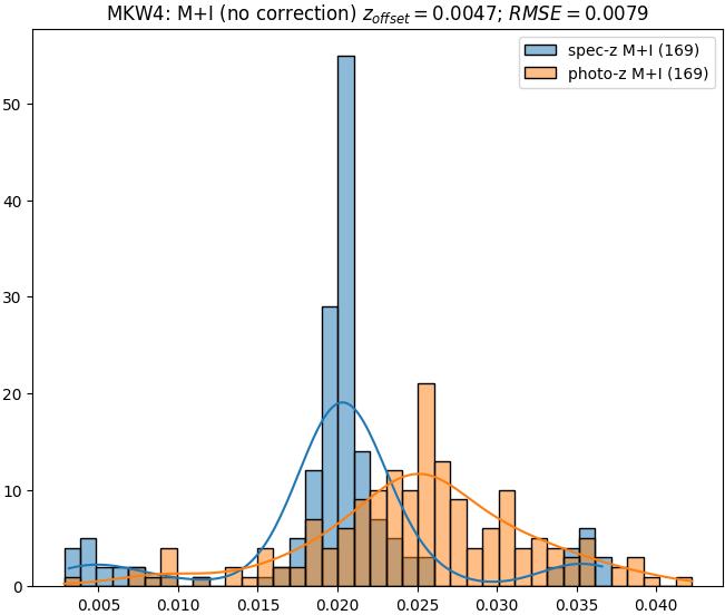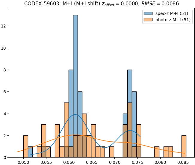- eM+I (M): RMSE between reference and estimated redshift corrected by members+interlopers-offset in the members sample