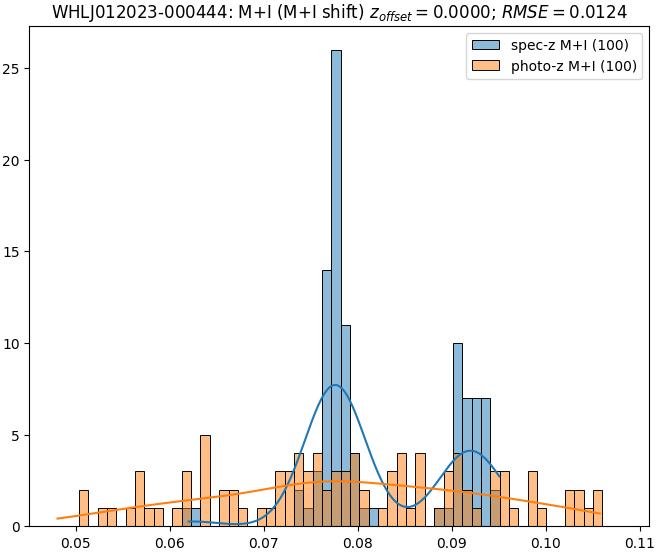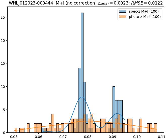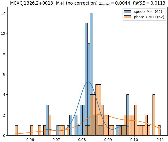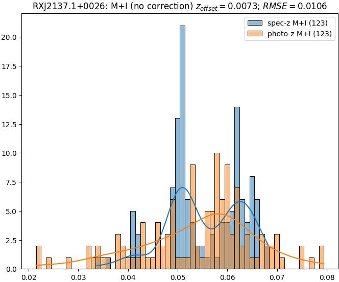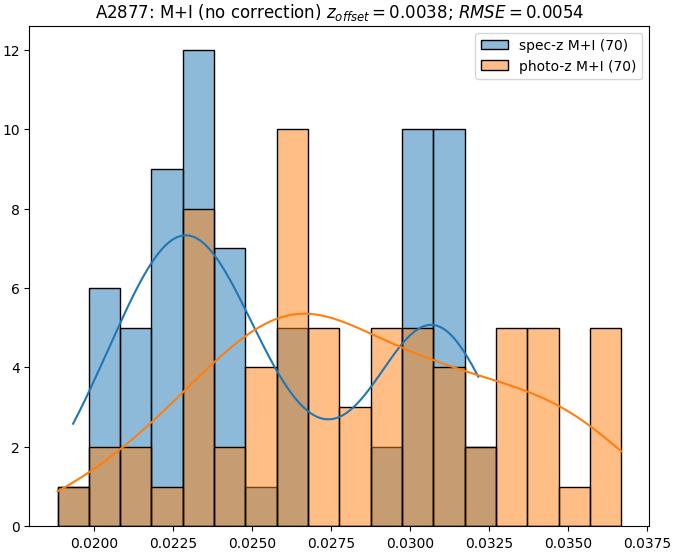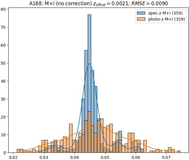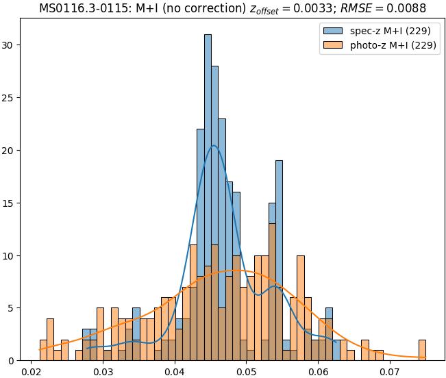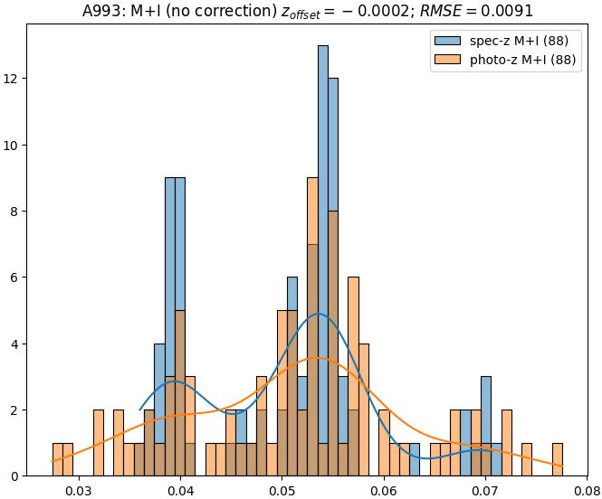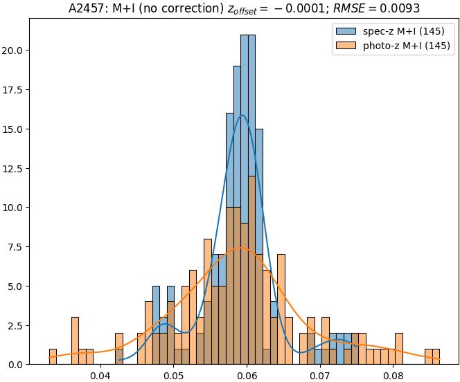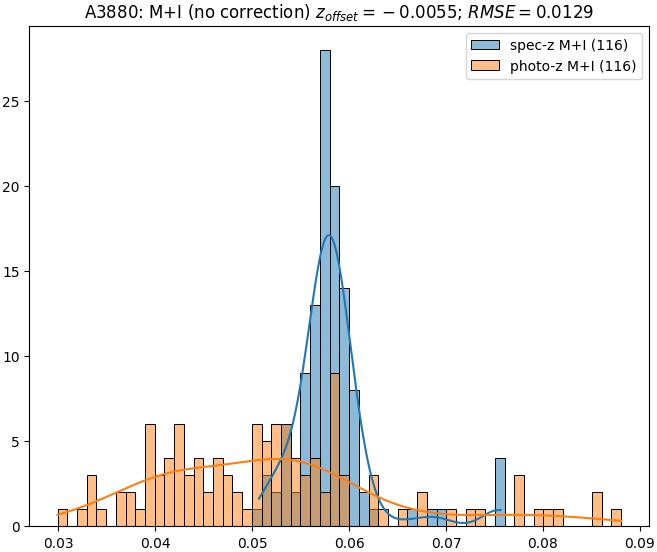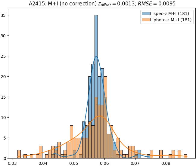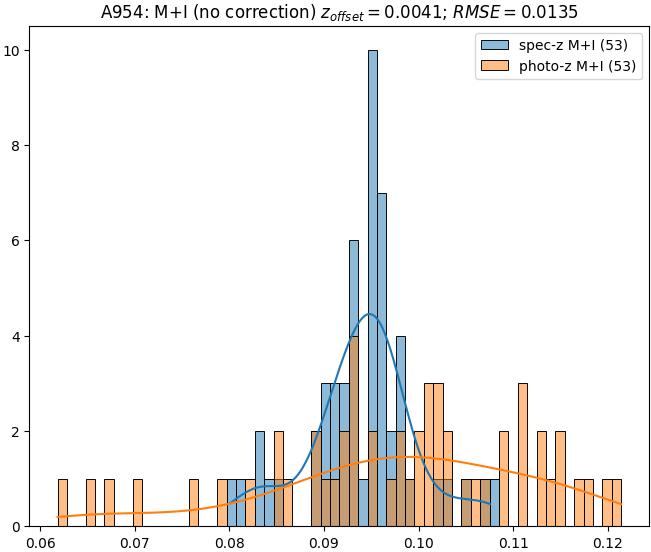 - ebase (M+I): RMSE between reference and estimated redshift without any correction (baseline) in the members+interlopers sample
